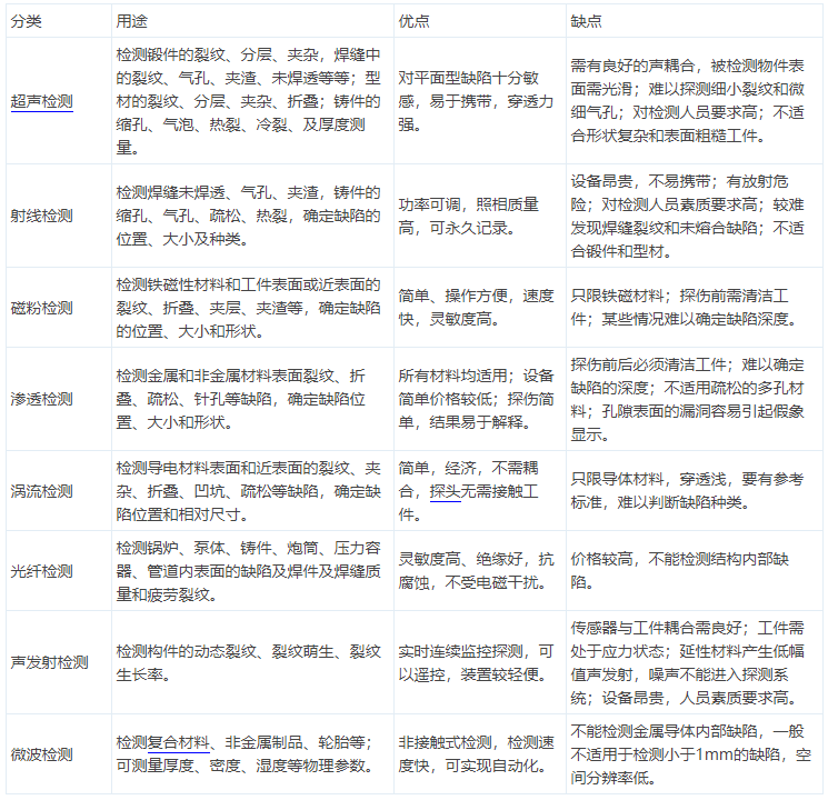 目前實(shí)際應(yīng)用中有很多種無損檢測(cè)方式,除了射線、超聲、磁粉、滲透、渦流這五大常規(guī)檢測(cè)之外,還有微波、聲發(fā)射、激光、紅外等等,下面為大家介紹的是幾種常用的無損檢測(cè)方式的用途、優(yōu)缺點(diǎn)。